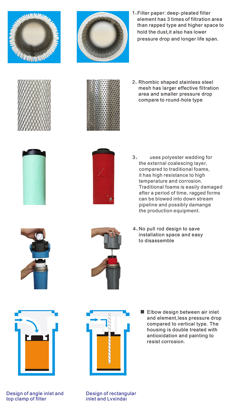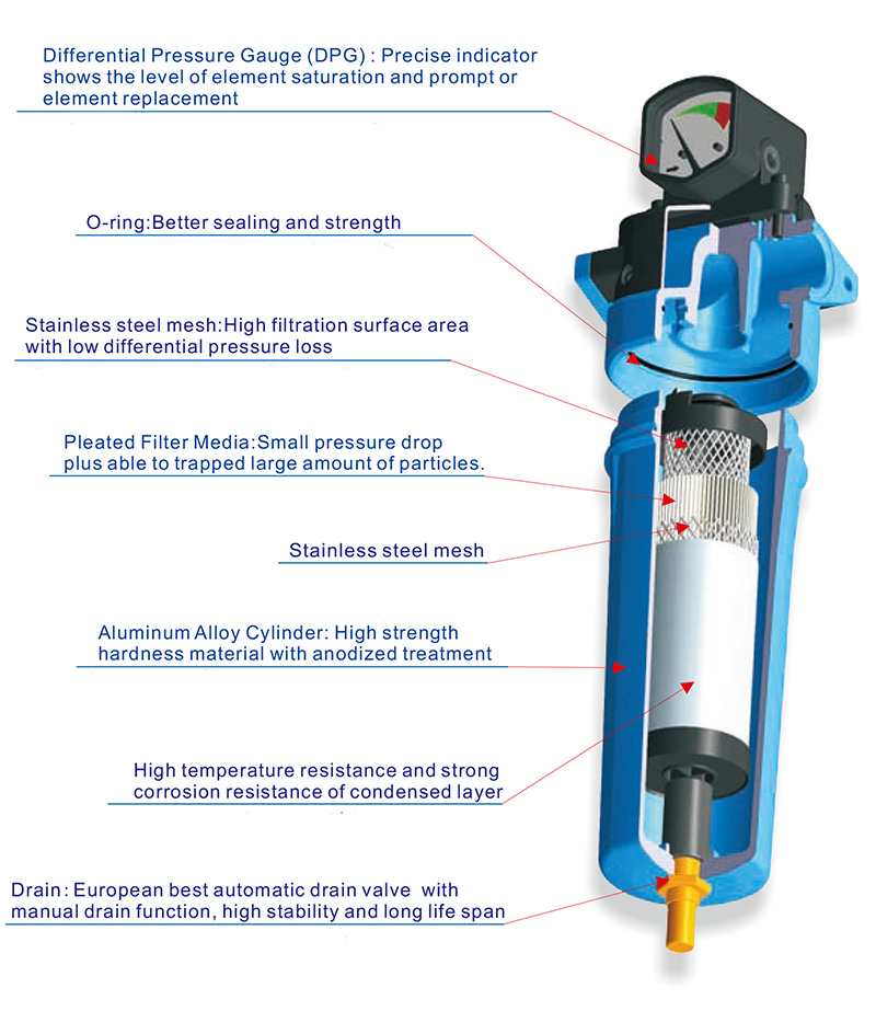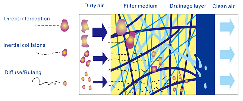 Quando o ar comprimido entra no filtro, a velocidade do fluxo reduz, gotas, partículas grandes e sólidas serão interceptadas diretamente à medida que passam pelo filtro de fibra de vidro.À medida que as gotas de diâmetro menor e as partículas sólidas passam pelo núcleo do filtro, elas são capturadas por colisões de inércia e